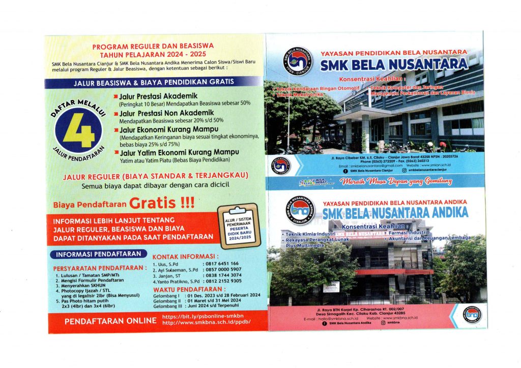 Pada Tahun Pelajaran 2024/2025 SMK Bela Nusantara Andika menerima calon siswa – siswi baru melalui program Reguler dan Jalur Khusus, dengan ketentuan sebagai berikut :